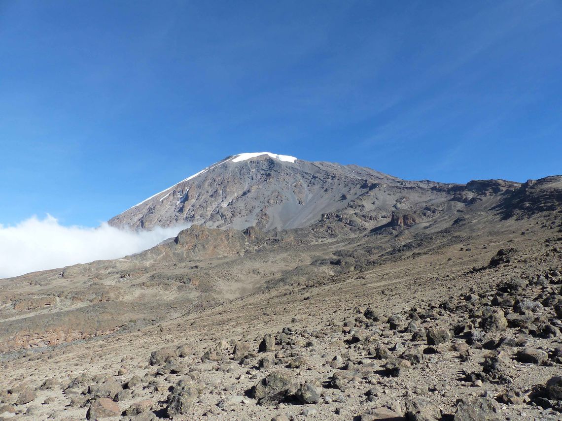 Heute beträgt die Gehzeit unserer Kilimanjaro-Besteigung in Tansania ca. 03:30 Stunden. Mit Blick auf unser Ziel, den Gipfel des Kilimanjaro, geht es durch karge, steinige Landschaft leicht ansteigend ins Basiscamp, welches sich auf 4.700 Meter Höhe befindet. Kurz vor Erreichen des Camps heißt es noch einmal, alle Kräfte zu mobilisieren, denn der letzte Abschnitt ist steil. Unsere Träger haben schon unser Zelt aufgebaut, mit Blick auf den Mawenzi. Sicher nicht so einfach, bei dieser großen Anzahl von Leuten noch so einen tollen Platz für unser Zelt zu finden. Wir bekommen ein warmes Mittagessen. Nachmittags steht Erholung vor dem großen Tag der Gipfelbesteigung des Kilimanjaros auf dem Programm, was uns bei leichtem Schneefall, der aber nach ca. 30 Minuten schon wieder aufhört, nicht schwerfällt. Nach einem frühen Abendessen und anschließender detaillierter Besprechung der Gipfelbesteigung des Kilimanjaros mit unserem Guide kuscheln wir uns in unsere angenehm wärmenden Schlafsäcke.