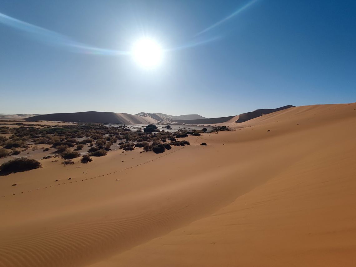 Unsere Weiterreise führte uns ins Sossusvlei-Gebiet zur Namib Outpost Lodge. Dort erwartete uns ein spektakulärer Sundowner, der die Ebene und die Vorläufer der Namib in ein magisches Licht tauchte. Am nächsten Morgen standen wir vor Sonnenaufgang auf, um den Namib Naukluft Nationalpark zu erkunden. Die Besteigung einer der majestätischen Dünen und der Besuch des Deadvlei mit seinen surrealen, abgestorbenen Akazien hinterließen einen bleibenden Eindruck. Bei 40 Grad Celsius führte uns der Weg weiter zum Sesriem Canyon, bevor wir abends unter einem atemberaubenden Sternenhimmel im Freien schliefen – ein Erlebnis, das man nie vergisst.