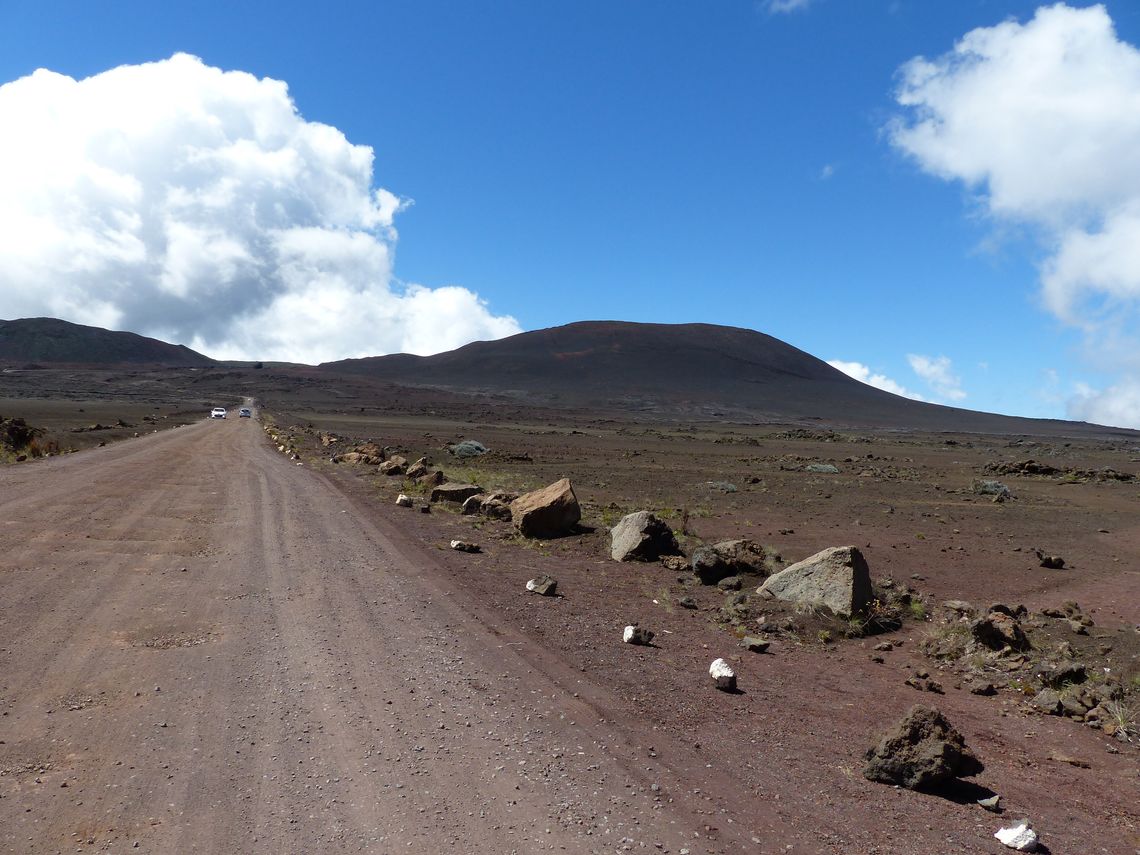Am Nachmittag führte die Fahrt über die Plaine de Sable (Sandebene), die einer Mondlandschaft gleicht, und durch unzählige Kurven zurück an die Küste zu den erloschenen, aber stellenweise noch heißen Lavaströmen des letzten Vulkanausbruchs, die an der Ostküste in das Meer fließen. Eine bizarre Landschaft auf La Réunion.